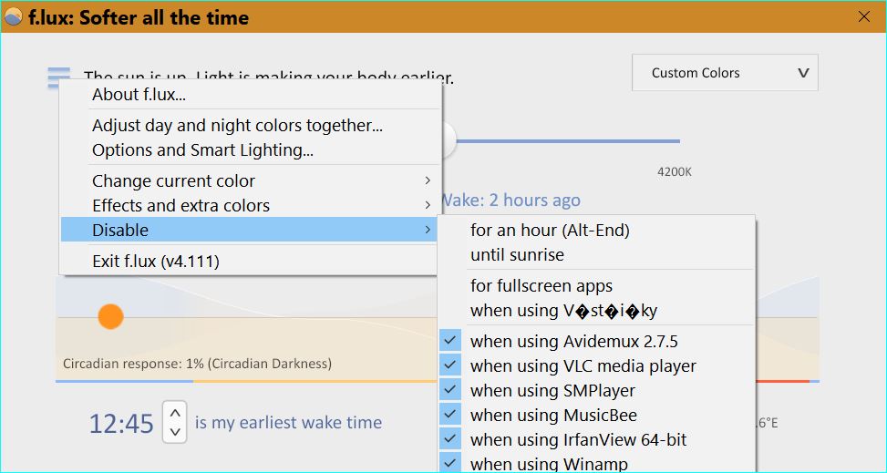 Pozn.: f.lux může v některém PC/operačním systému nečekaně zatěžovat disk. Dobrou alternativou je aplikace LightBulb, která má všechny funkce jako f.lux. Zapíná se automaticky při startu systému, ikona aplikace (pro nastavení) je umístěna v ohrádce systray. Vyjímky (automatické vypnutí) se zadávají v nastavení při zapnuté aplikaci, která má být vyloučena z korekce světla (označíme položku).